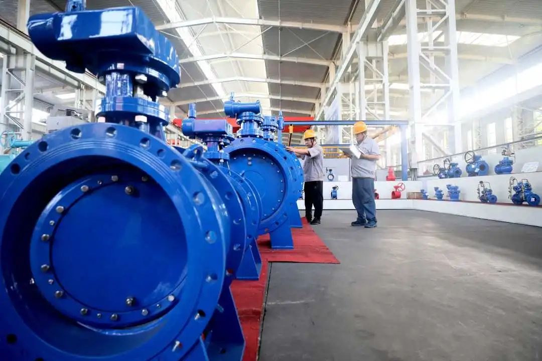 7月7日,河北省隆堯縣一家閥門集團鑄鐵大口徑加工組裝車間,員工對研發的高性能閥門產品進行檢測。